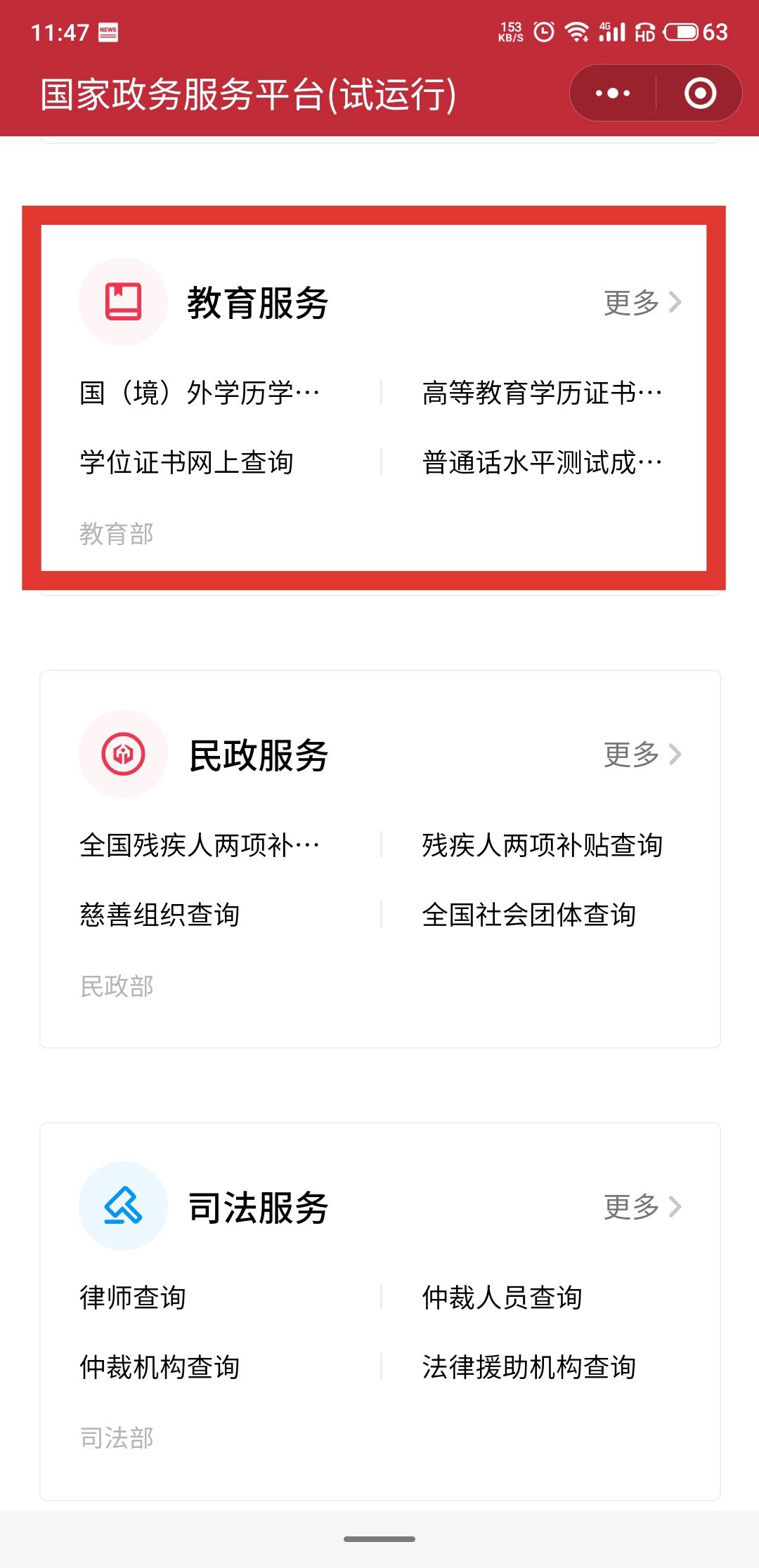 第一步:進入百度,搜索國家政務(wù)服務(wù)平臺小程序,進入小程序,找到教育服務(wù),點擊『更多』