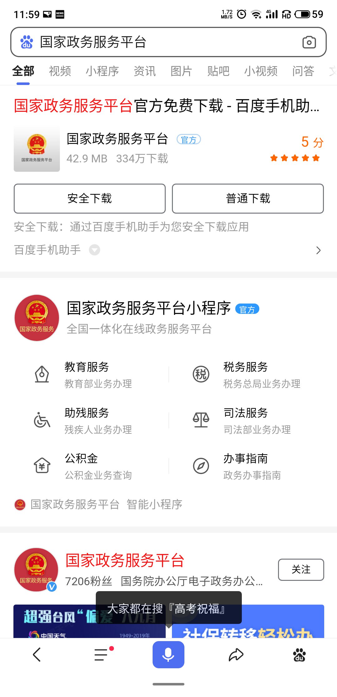 第一步:進入百度,搜索國家政務(wù)服務(wù)平臺小程序,進入小程序,找到教育服務(wù),點擊『更多』
