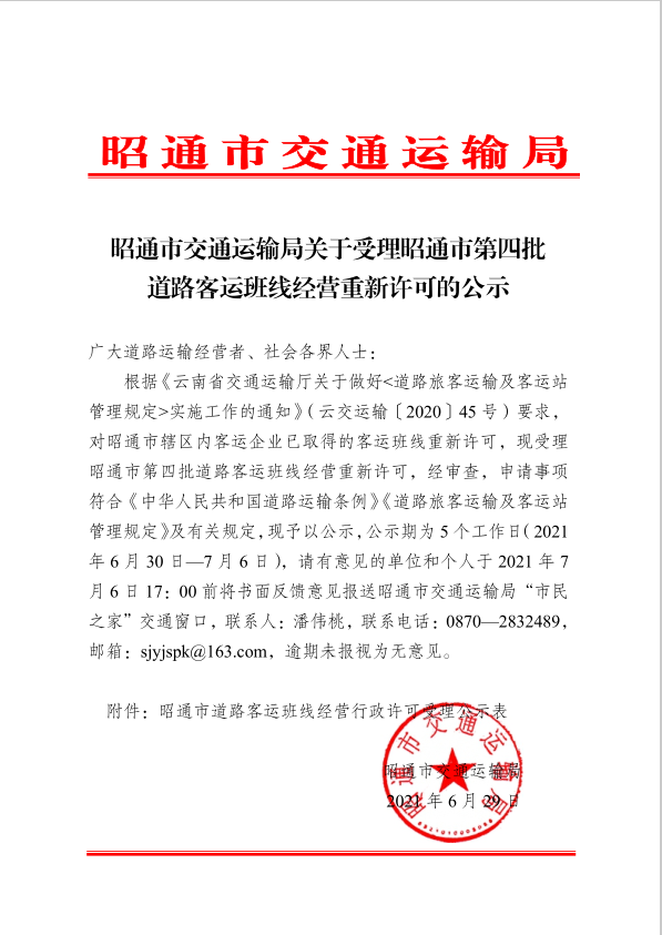 昭通市交通運輸局關于受理昭通市第四批 道路客運班線經(jīng)營重新許