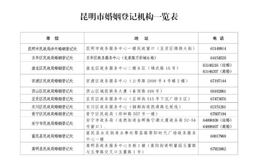 昆明市婚姻登記機(jī)構(gòu)一覽表(2021年)