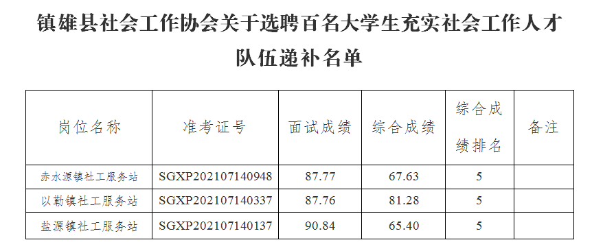 鎮(zhèn)雄縣社會(huì)工作協(xié)會(huì)發(fā)布了選聘百名大學(xué)生充實(shí)社會(huì)工作人才隊(duì)伍面試成績(jī)及綜合成績(jī)公告后,部分崗位考生放棄選聘資格。按照既定方案,以崗位綜合成績(jī)從高到低的順序依次遞補(bǔ),現(xiàn)將遞補(bǔ)人員名單予以公告。請(qǐng)遞補(bǔ)考生于2021年7月29日前提交體檢材料。