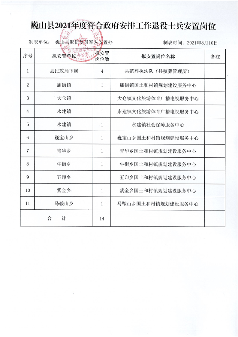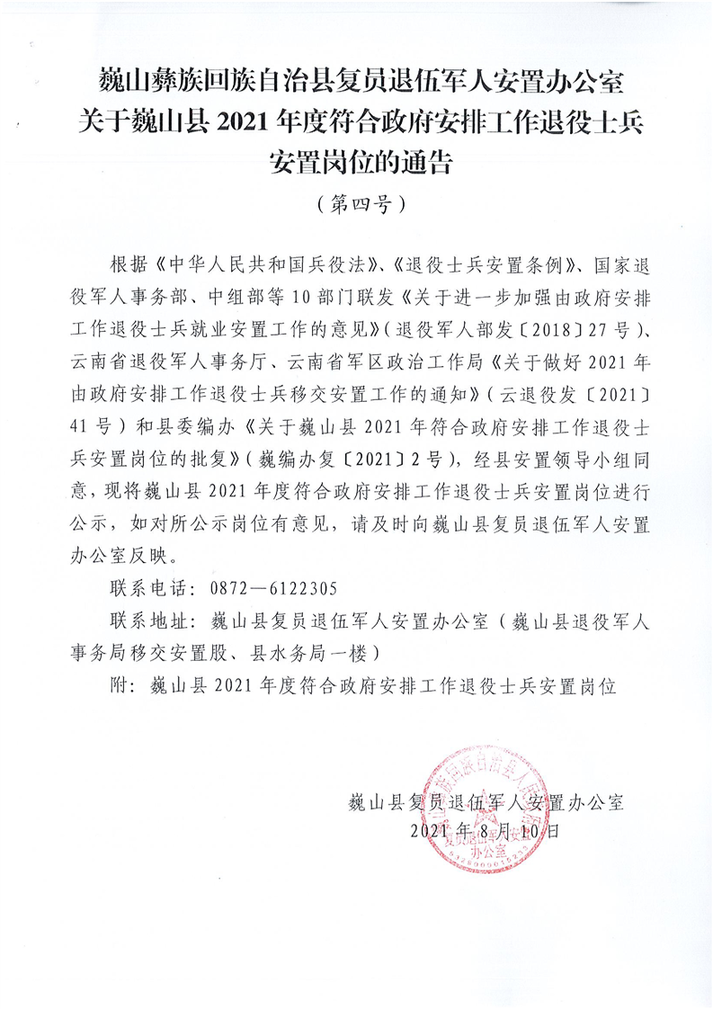 大理州巍山彝族回族自治縣復員退伍軍人安置辦公室關于巍山縣2021年退役士兵安置崗位的通告