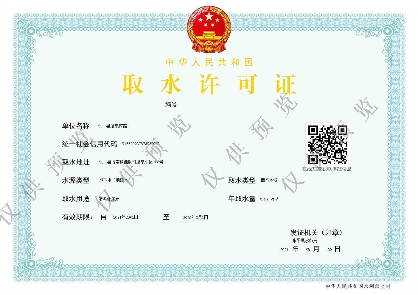一、同意給予永平縣溫泉賓館核發(fā)取水許可證。取水地點、取水量、退水地點、退水量、取水用途及最小生態(tài)下泄流量等嚴格按照《永平縣水務局關(guān)于準予永平縣溫泉賓館取水許可申請的行政許可決定書》(永水許〔2021〕1號)執(zhí)行。