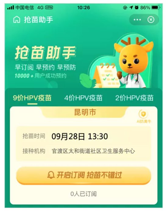 溫馨提醒:HPV疫苗目前關注用戶眾多,該狀況下,此次開放的疫苗極有可能會短時間內被迅速預約完,如本次未能預約上,敬請理解!