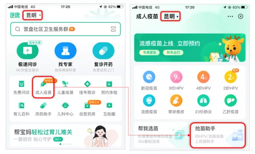 第一步:進入官網后,選擇“昆明”地區(qū),點擊首頁“成人疫苗”,進入頁面后再點擊“搶苗助手”;