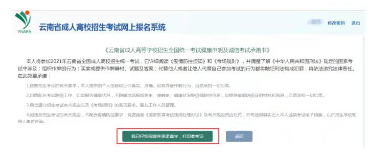 8.考生要仔細(xì)閱讀《云南省成人高等學(xué)校招生全國(guó)統(tǒng)一考試健康申明及誠(chéng)信考試承諾書(shū)》,點(diǎn)擊“我已仔細(xì)閱讀并承諾遵守,打印準(zhǔn)考證”按鈕。