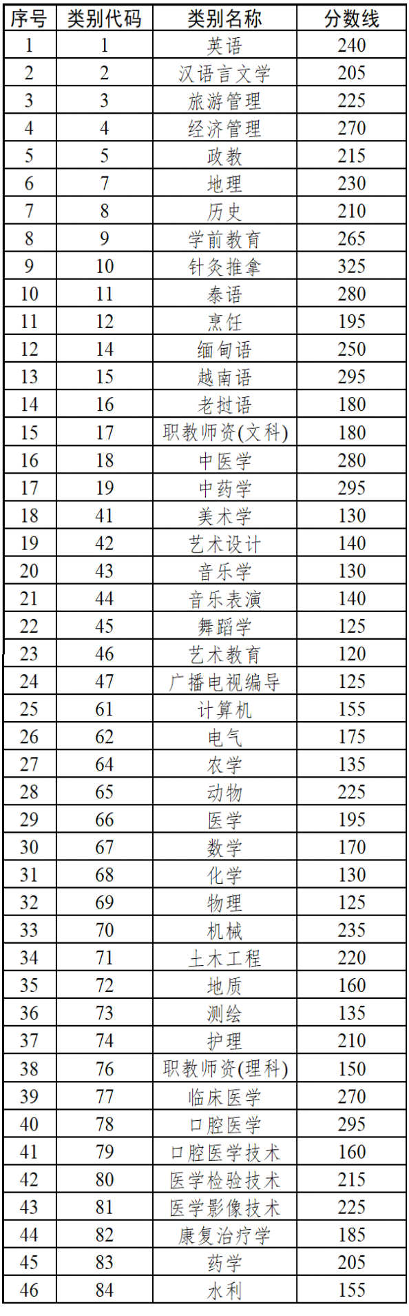 云南省2022年普通高等學(xué)校本科招收應(yīng)屆?飘厴I(yè)生升學(xué)統(tǒng)一考試各專業(yè)類別分數(shù)線