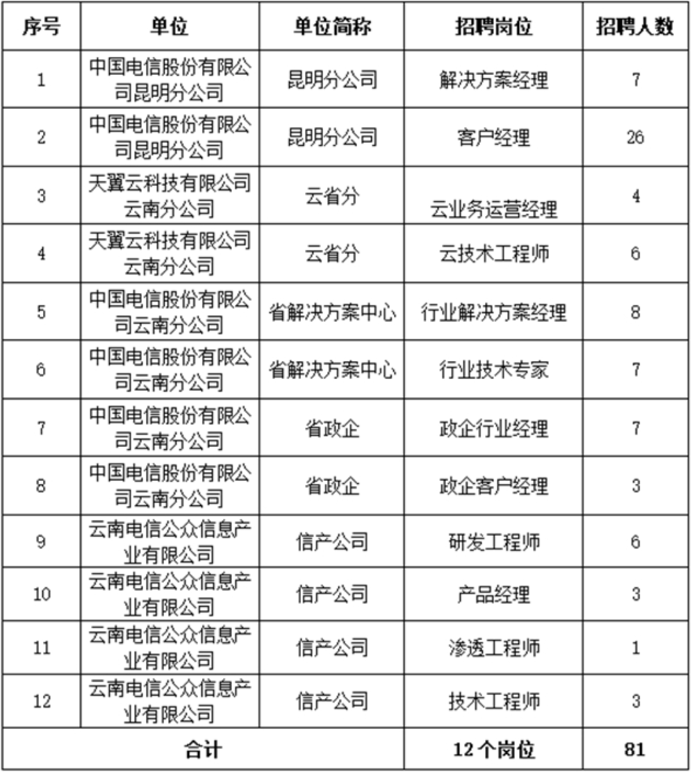 中國電信股份有限公司云南分公司(以下簡稱“中國電信云南公司”)是中央特大型國有企業(yè)——中國電信股份有限公司在云南的區(qū)域分公司,在全省16個州市設(shè)分支機構(gòu)。為傳承紅色基因的通信央企,秉承經(jīng)濟責任、政治責任、社會責任的有機統(tǒng)一,賡續(xù)“聽黨指揮、信念堅定、一心為民、變革創(chuàng)新、崇尚科技、安全暢通”的紅色電信精神,堅守“黨領(lǐng)導下完成政治任務(wù)的經(jīng)濟組織”、“建設(shè)網(wǎng)絡(luò)強國、數(shù)字中國和維護網(wǎng)信安全的主力軍”和“領(lǐng)先的綜合智能信息服務(wù)運營商”的企業(yè)使命愿景。中國電信云南公司持續(xù)推進云改數(shù)轉(zhuǎn)戰(zhàn)略轉(zhuǎn)型、深化企業(yè)改革,為客戶提供靈活多樣、融合便捷、品質(zhì)體驗、綠色安全的綜合智能信息服務(wù)。為推進中國電信云南公司人才隊伍高端化、人才配置市場化、人才開發(fā)一體化,現(xiàn)就2022年度社會招聘有關(guān)事項公告如下: