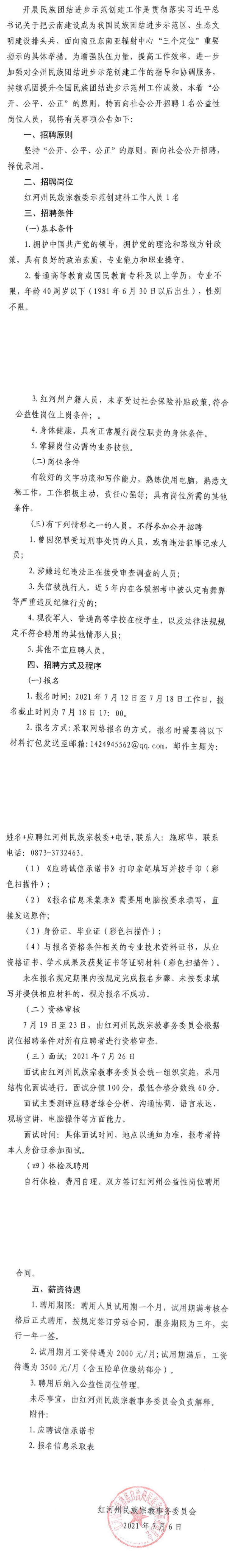 紅河州民族宗教事務委員會關于招聘公益性崗位工作人員的公告