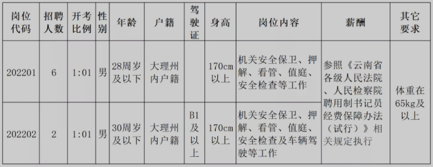 大理州中級(jí)人民法院2022年公開定向招聘合同制法警招聘崗位、人數(shù)、及薪酬