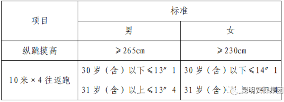 3.縱跳摸高、10米×4往返跑科目采取一票否決制,達(dá)到規(guī)定項(xiàng)目標(biāo)準(zhǔn)即為合格,否則為不合格,不合格人員不得參與后續(xù)環(huán)節(jié)的考核,測試標(biāo)準(zhǔn):