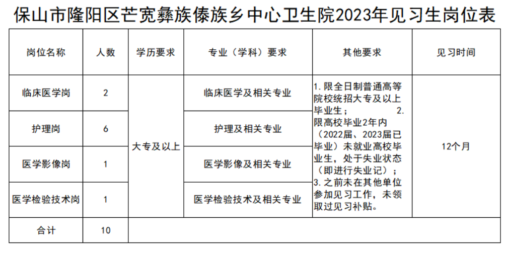 保山市隆陽區(qū)芒寬彝族傣族鄉(xiāng)中心衛(wèi)生院2023年見習(xí)生崗位表 |