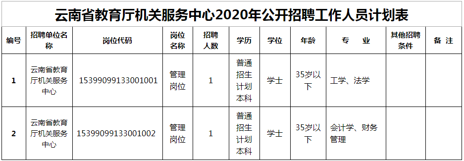 公開招聘管理崗位工作人員2名;凡符合條件的人員均可報名參加本次公開招聘。招聘范圍和條件(詳見附件1《云南省教育廳機(jī)關(guān)服務(wù)中心2020年公開招聘計劃表》),年齡計算截止日期2020年9月1日。