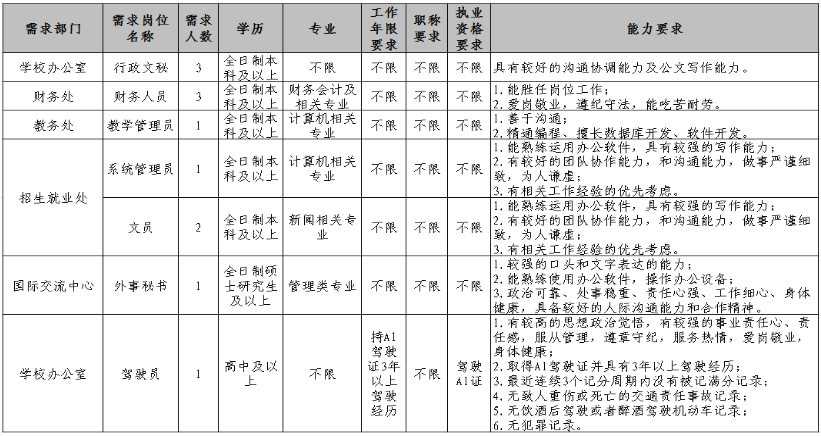 為適應學校發(fā)展的需要,需面向社會誠聘12名工作人員,現(xiàn)將有關事項公告如下: